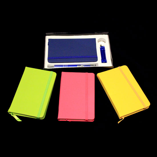 The notebook set looks attractive and eye-catching in its vibrant colors. The notebook set is well equipped with a paper-made notebook, a metal torch and a metal pen. The well-organized notebook set in a box is an ideal selection for your stationery accessories.