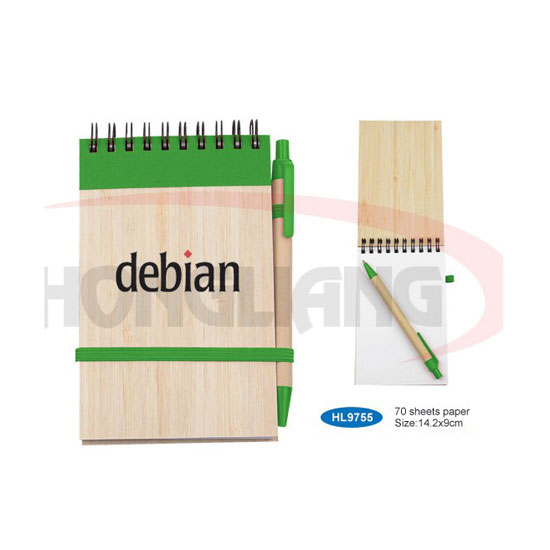 This stationery set includes a notebook and a pen. The spiral notebook features a hard cover in a pattern of wood grain with green details. The retractable pen in the same pattern makes a perfect with the notebook.