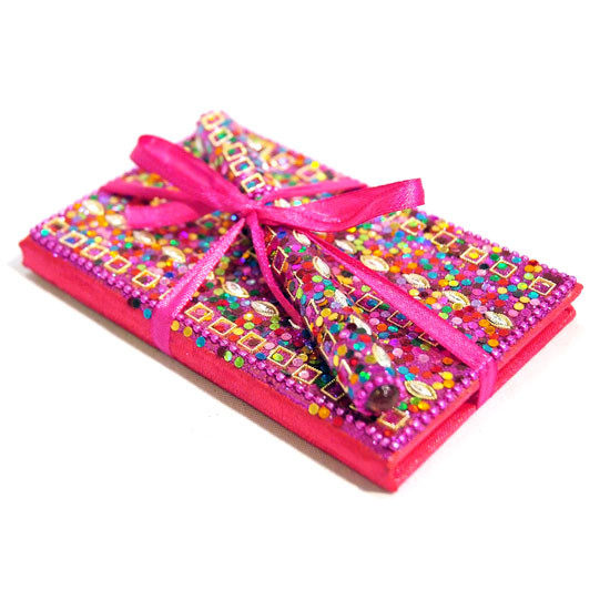 The notebook and pen feature a consistent design with colorful glitter on top. The two items are tied together using a slender ribbon in matching pink. Fancy yet practical, they make an perfect gift idea for kids, your friends, etc.