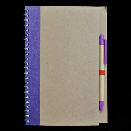 The ring-bound notebook features a rugged cover with a hint of purple for a fashion touch. A matching ball pen is included and secured with the loop that holds the pen in place. Made of recycled paper, this notebook is a great choice for green-minded folks.