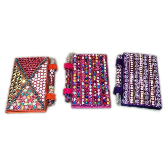 The notebook features glittery sequins and beads with an attached pen. The notebook showcases excellent embroidery and craftsmanship. The notebook features the same motif with the pen for the perfect fashion.