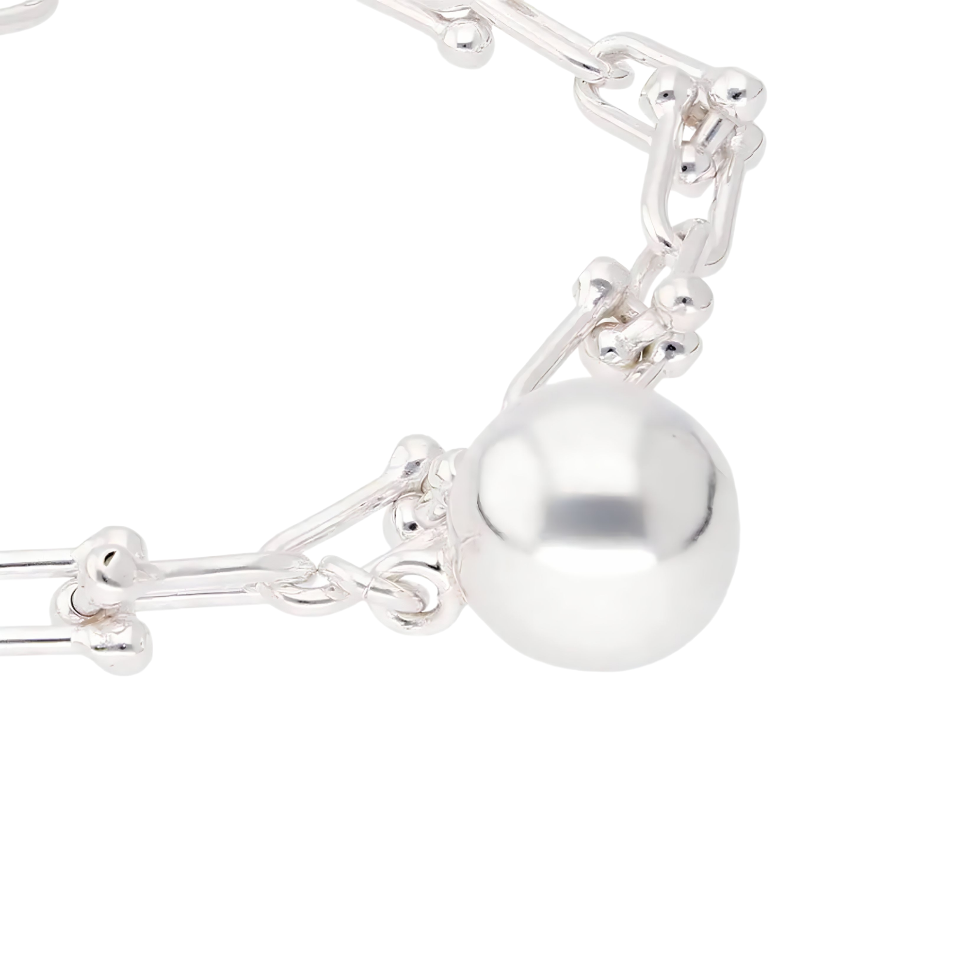 It is an elegant and sophisticated piece that combines a modern design. It is made up of silver chain links with small balls at the ends, creating an interesting and dynamic visual effect. The chain is fastened with a shiny silver sphere clasp, adding a touch of glamour and sophistication to the set.