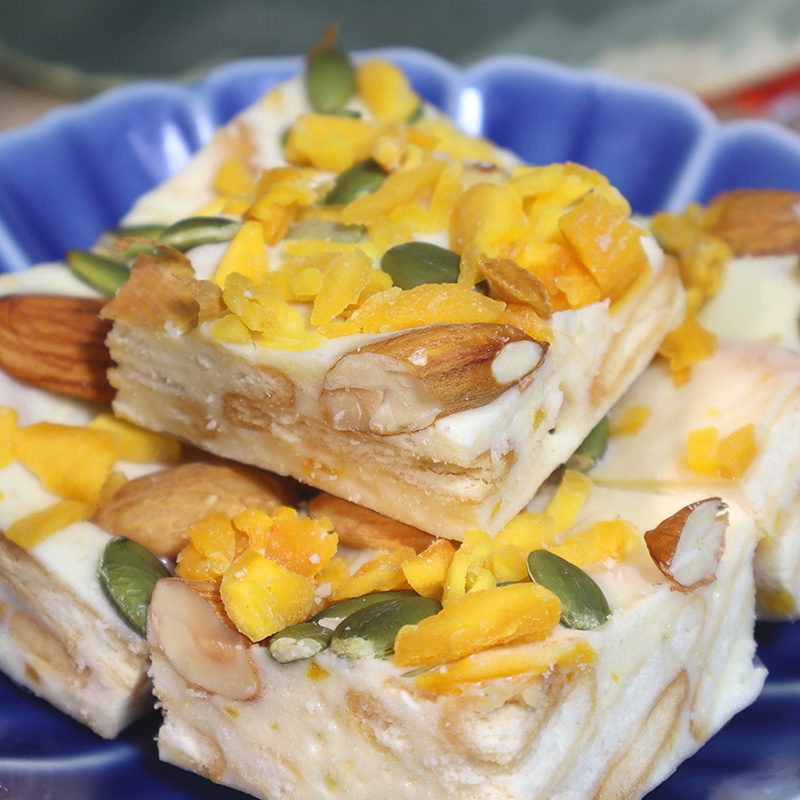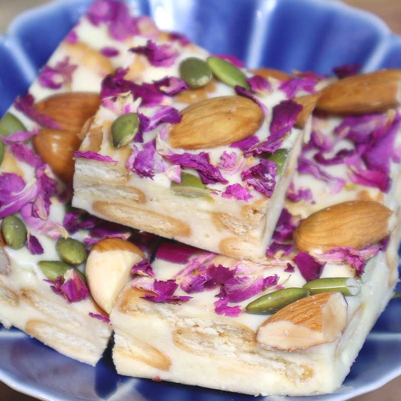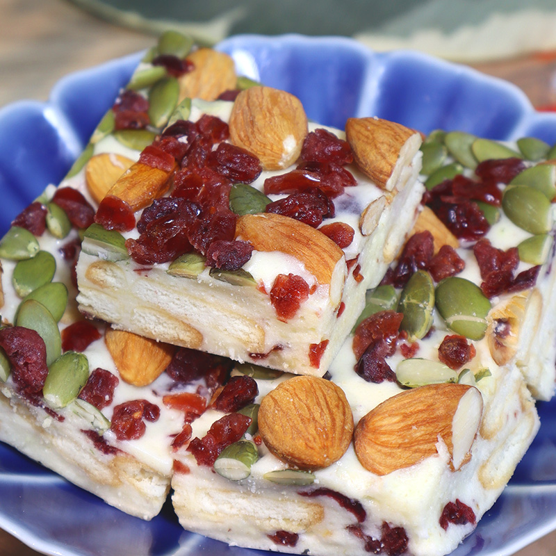 A square nutty milk shortbread candy lies quietly as you peel off the off-white oiled paper. Its body is a pale milky white, like milk cream kissed by sunlight, with a delicate sheen on the surface. Drawing closer, you can clearly see the nut pieces embedded within—plump melon seeds and crispy almonds. These brownish fragments, varying in depth, are like stars scattered across a milk field, simple yet irresistible.