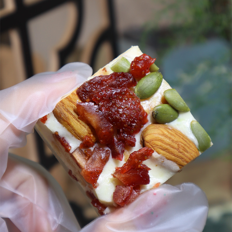 As you chew, the crispness of the nuts surprises you unexpectedly. The mellow depth of melon seeds and the subtle bitterness of almonds harmonize beautifully with the milkiness, balancing the sweetness of the sugar while transforming the texture from dense smoothness to a rich, granular feel. Each bite is like a gentle collision in your mouth—the softness of milk against the crunch of nuts, the lingering sweetness against the aroma of nuts—layer upon layer spreading across your taste buds.