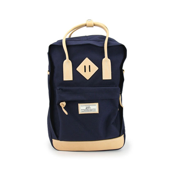 This is a backpack with a fashionable and stylish design. It comes in dark blue with beige leather accents. This backpack comes with two sturdy handles for added convenience.