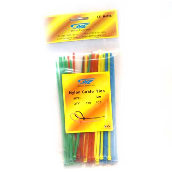 Featured here is a package of nylon cable ties in a variety of colors. These functional cable ties make the installation of wiring systems quick and well organized. These self-gripping ties are adjustable and reusable.