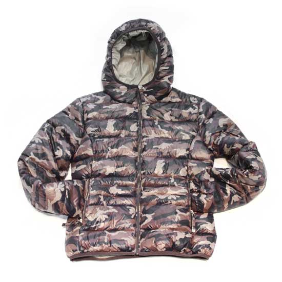 This highlighted nylon jacket comes with a matching hood and a zip-up front closure. The brown-toned camouflage patterns showcase a stylish finish. This displayed nylon jacket goes great with jeans for a casual look.