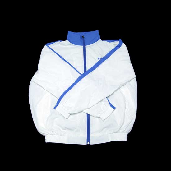 This nylon jacket is designed with a hoodie collar, a zippered front, elastic cuffs and long sleeves. The allover white and blue hues create a striking effect. This stylish jacket is ideal for wearing on spring and autumn days.