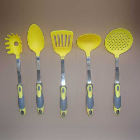 Showcased is a nylon kitchenware set that comes with a spaghetti fork, turner, fry turner, serving spoon, slotted spoon and ladle. The handle is made of PP with an ergonomic design that gives a comfortable gripping experience. This potent kitchenware set is a durable cooking aid for housewives.