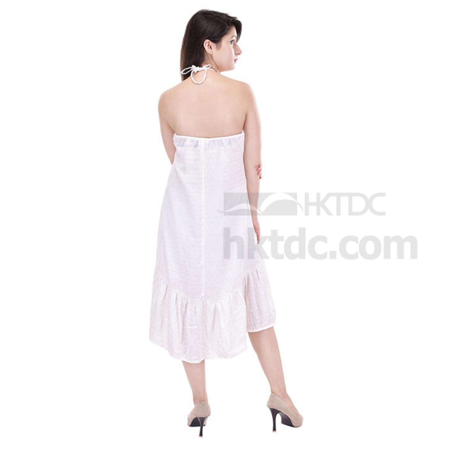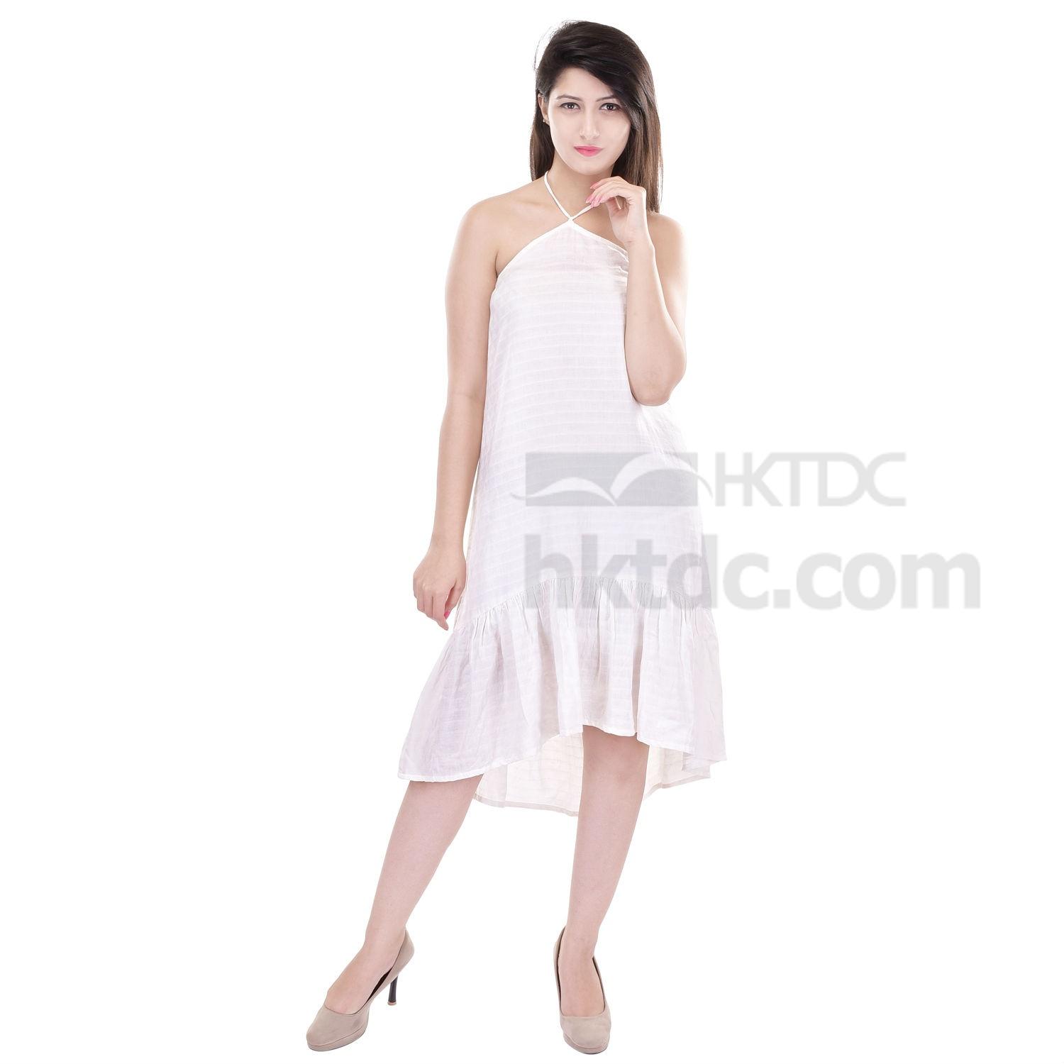 This off-white, off-shoulder dress is made in cotton dobby with trianguar self weave and features a ruffled irregular hemline. The halter-neck and breathable fabric and design give it a summer beach holiday feel.