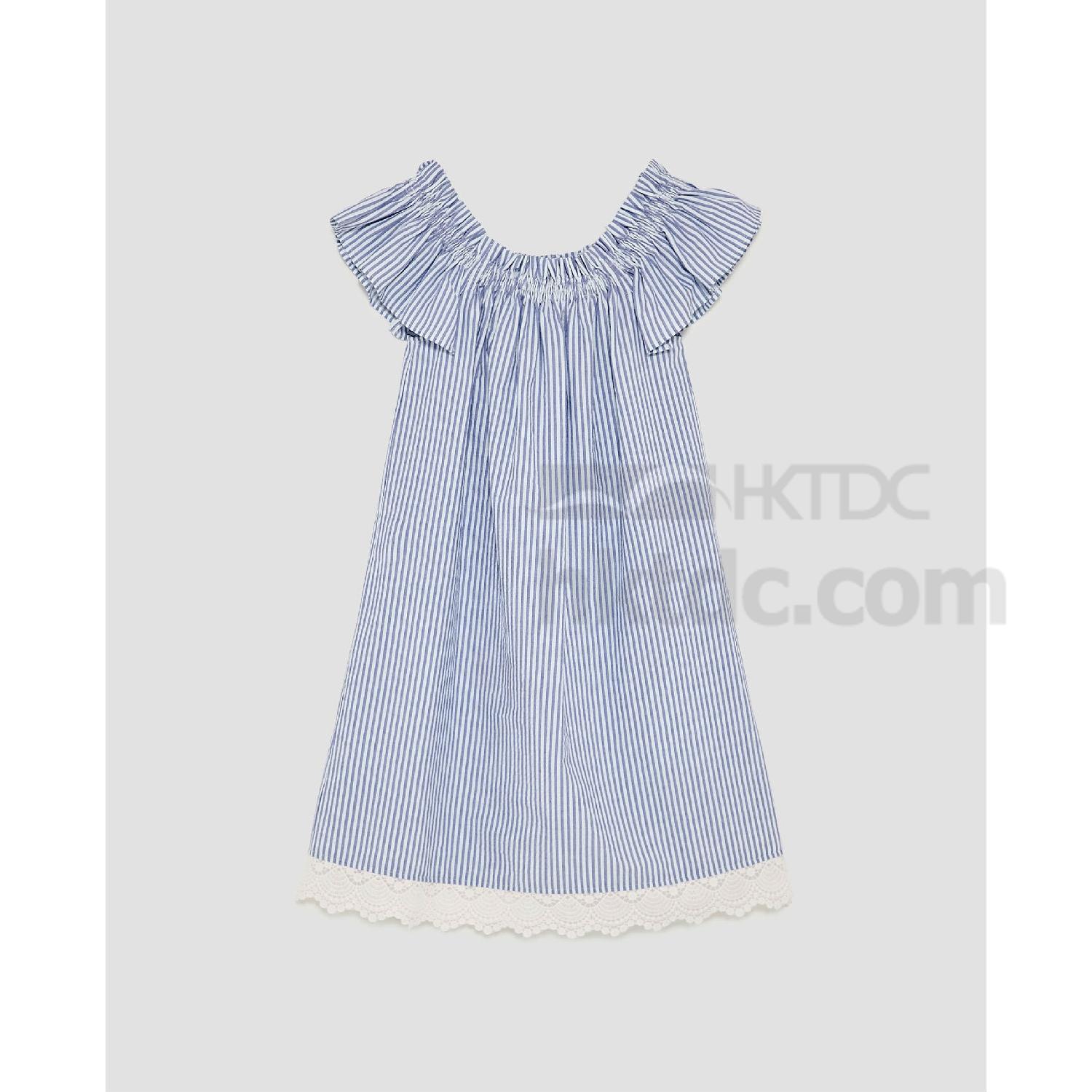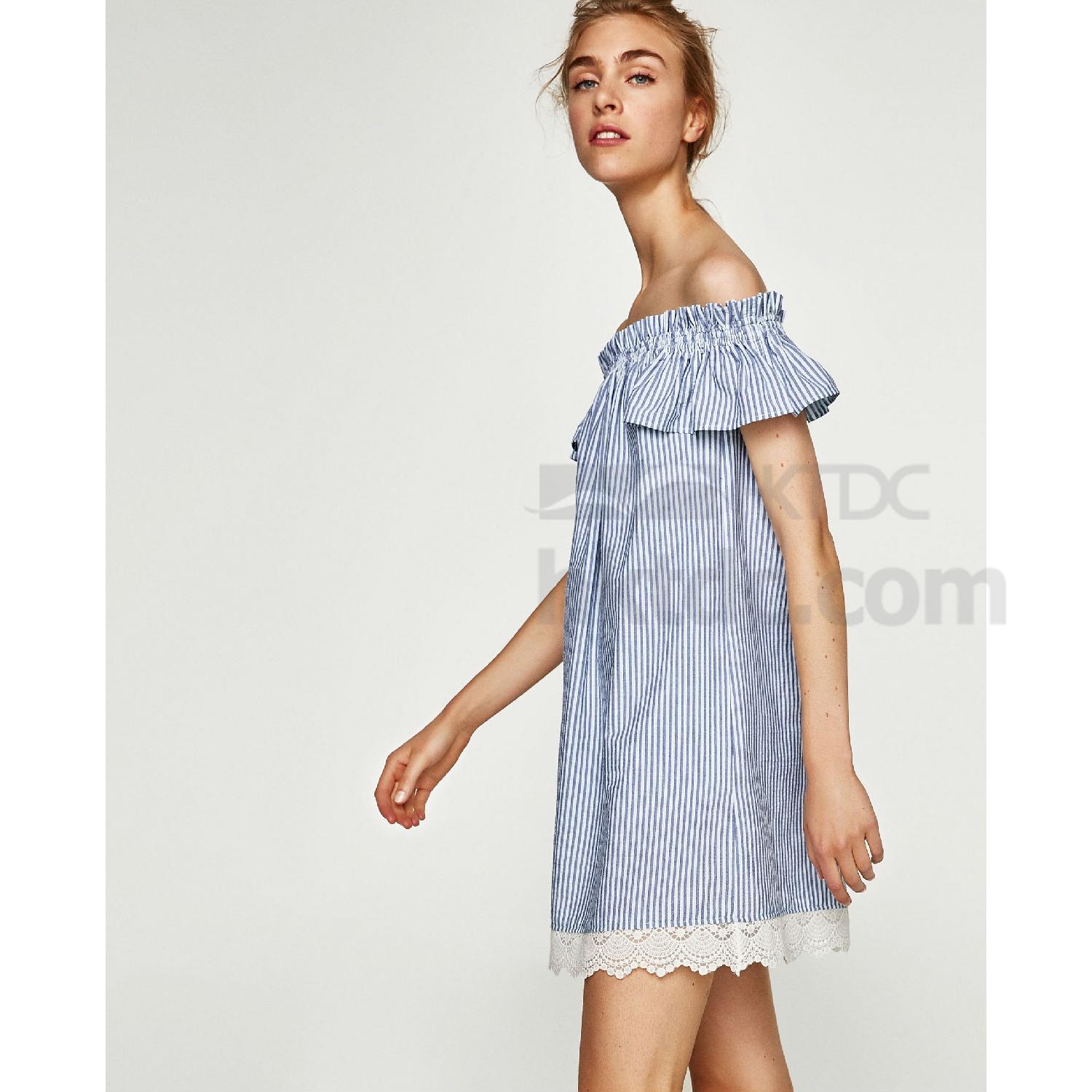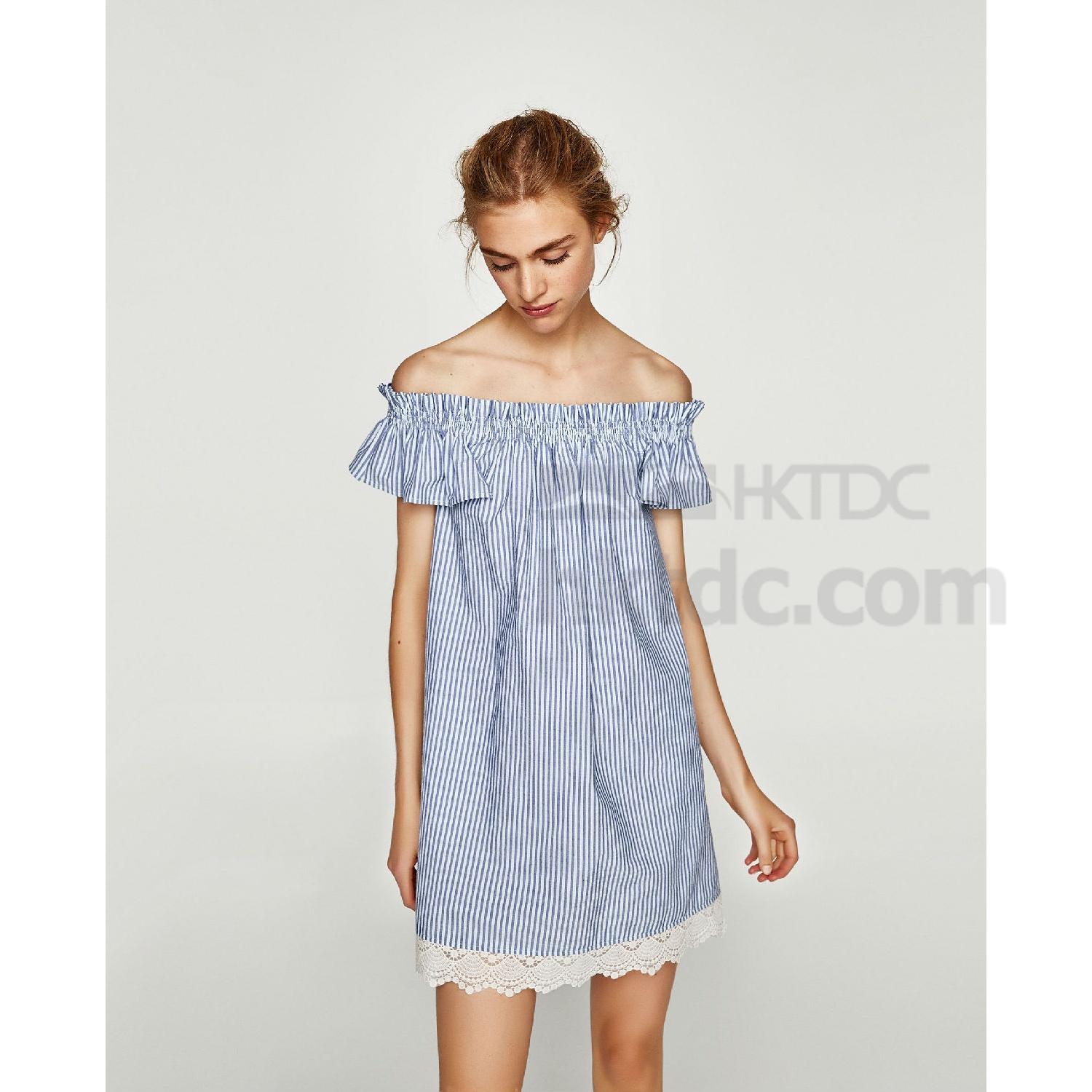 Dress with exposed shoulders, lace trim along the hemline, elastic neckline and hidden side pockets.
