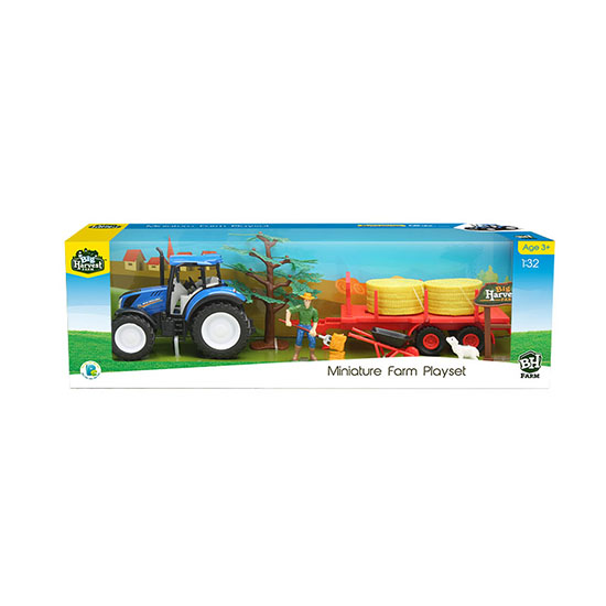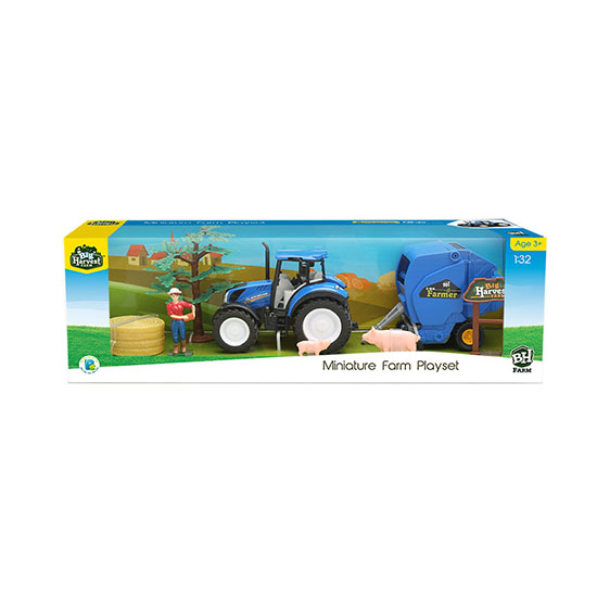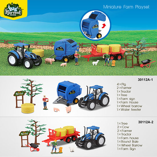 set of 1: 1 tractor, 1 hay baler, 1 farmer, 2 pigs, 1 round bale, 1 tree, 1 farm sign