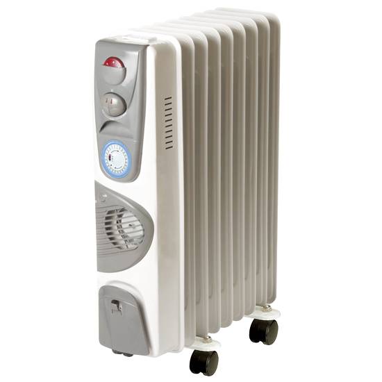 The featuring appliance is an oil heater used in used domestic heating, which is commonly used in bedrooms and other small-to-medium-sized enclosed areas. It is attached with four wheels at the bottom and is therefore movable.