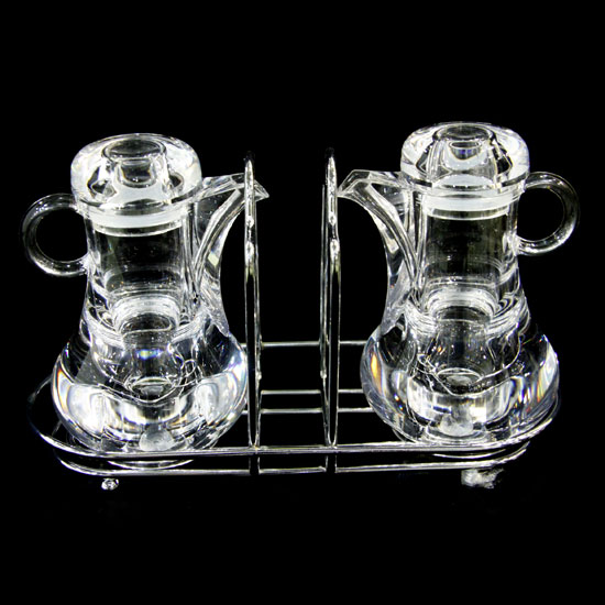 Featured here is an oil-and-vinegar bottle set in durable acrylic construction. They come with an elegant stand in a quality metal finish. This handsome oil-and-vinegar bottle set makes an elegant addition to your kitchen.