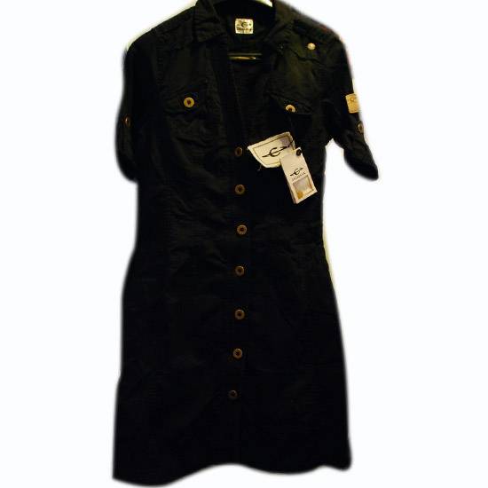 The pointed collar of this dress fills this dress with a boyish style. It is made of black denim for a cool appearance. The metal buttons further enrich the design. Create a stylish casual look with this dress in summer.