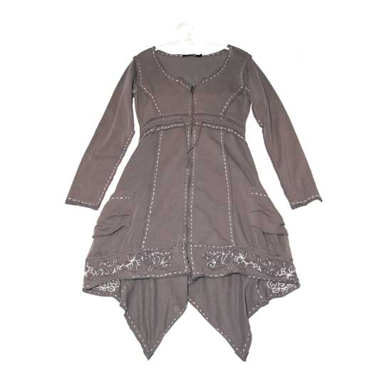 The featured one-piece dress comes with a slim cut and long sleeves. The dress boasts a cool design with a zip-up front and an irregular skirt. Embroidery is added to show extra style for this dress.