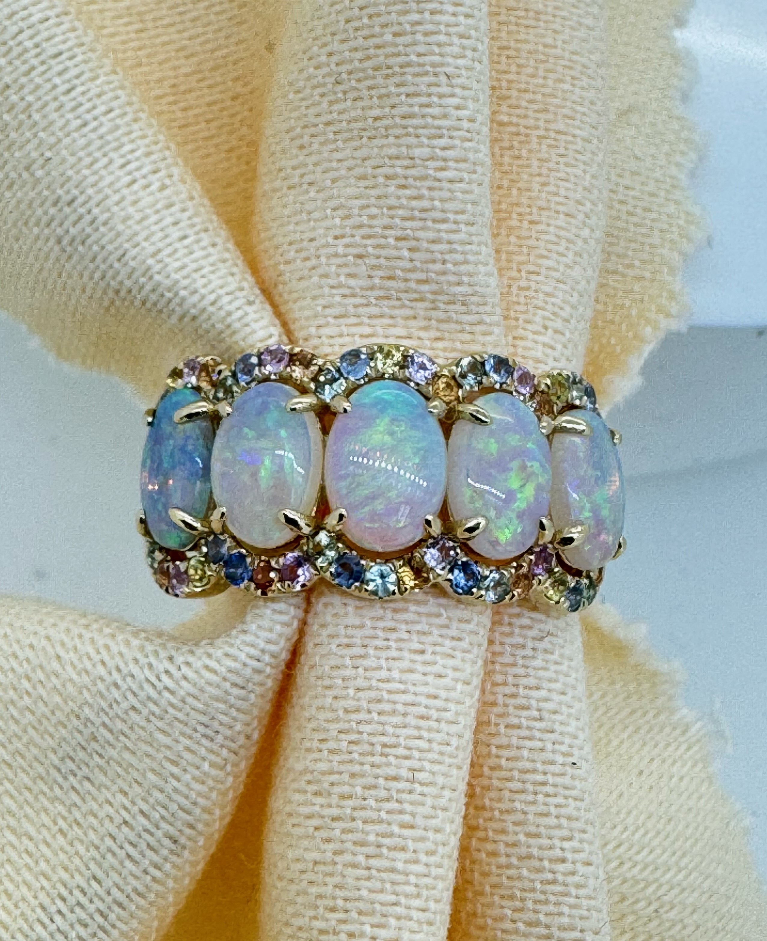 Natural Oval shape Opals, 5x7mm, 5 pieces; with small round Fancy Sapphire, total 0.59ct; in 14K yellow Gold,