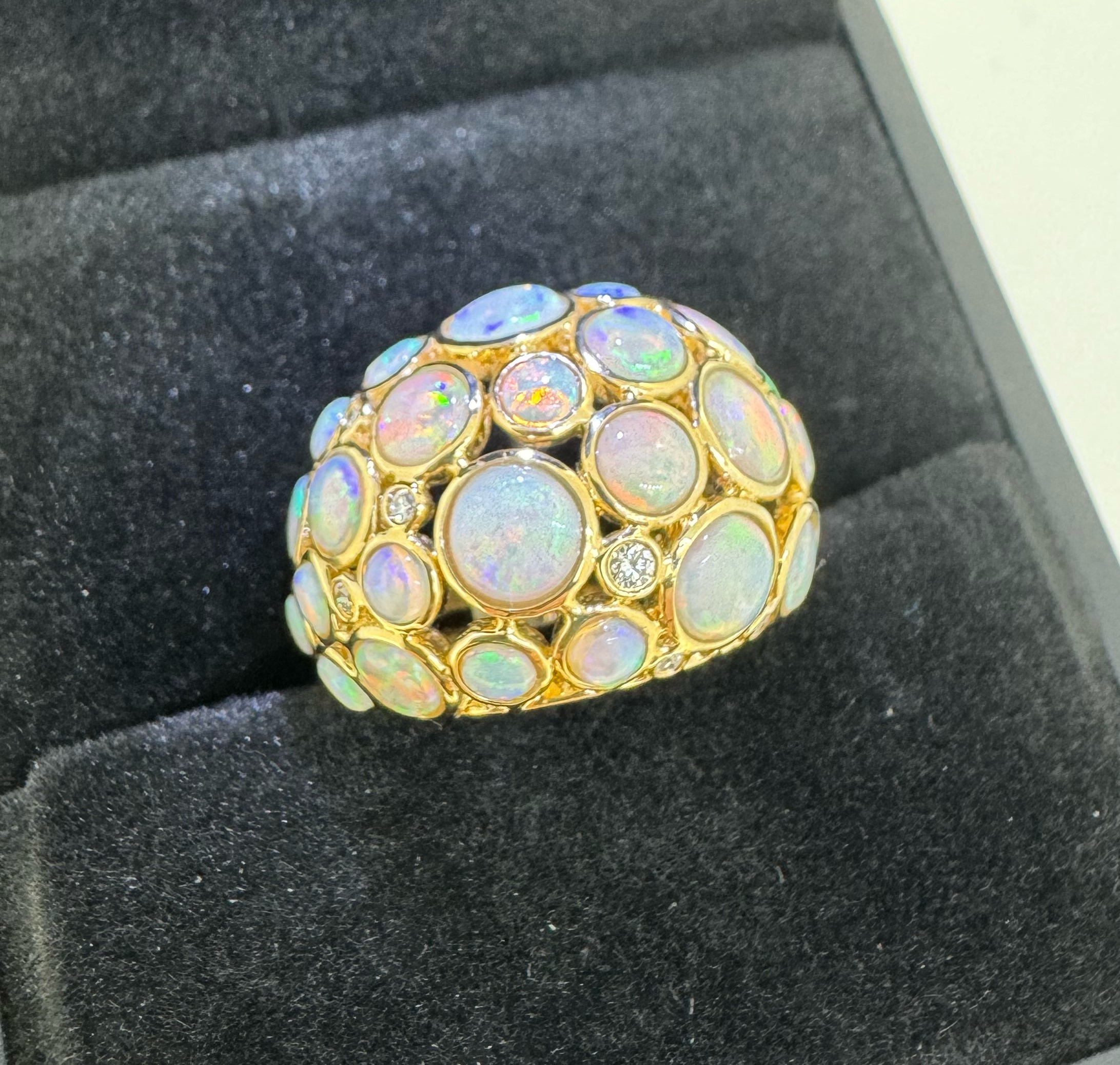 Natural Round shape Opals, diameter from 3-5mm, total 26 pieces; with natural round diamond, 13pcs total 0.13ct; in 14K yellow gold.