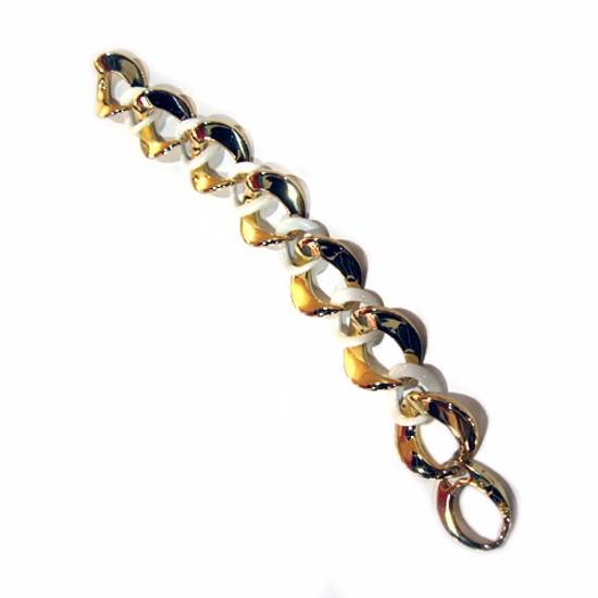 This is a open link chain. The chain is composed of interlacing big and small loops. The big loops are of gold and high polished. The small loops are white.