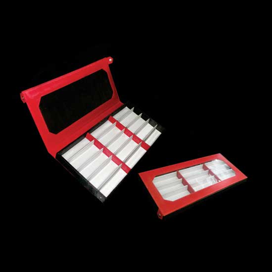The presented display tray is divided into assorted compartments for holding 15 pairs of eyewear at one time. It features clear window lid for easy display. This outlined optical stock tray is great for eyewear retail store use.
