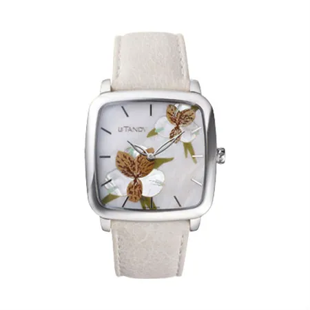 This quartz watch sports a gemstone analog dial face beautifully crafted with orchid flower motifs dressed in a rectangular stainless steel case. Secured with a leather strap for comfortable wearing, this sophisticated piece makes a stylish accessory to almost any outfit.