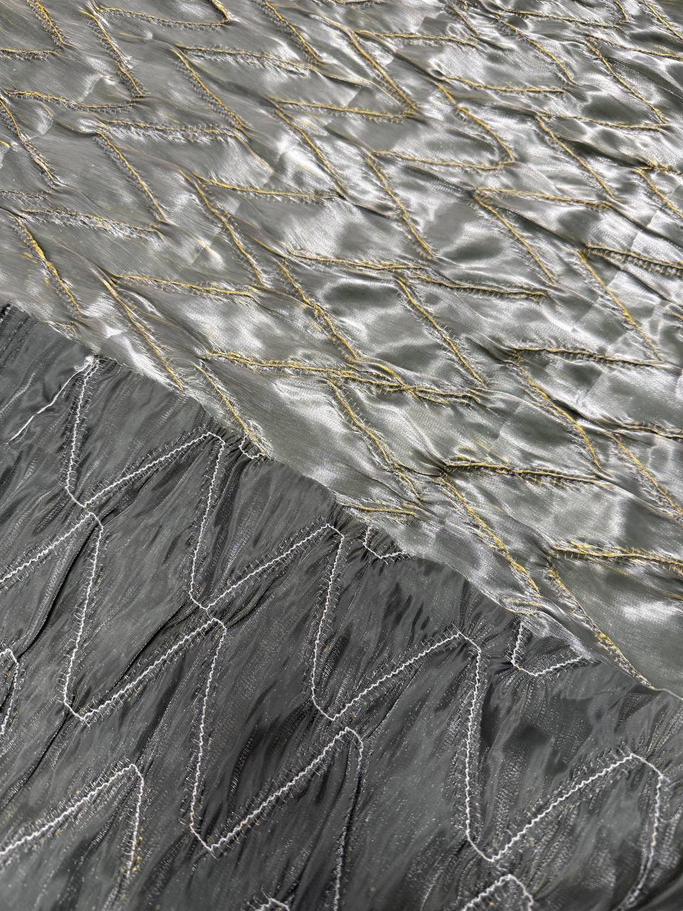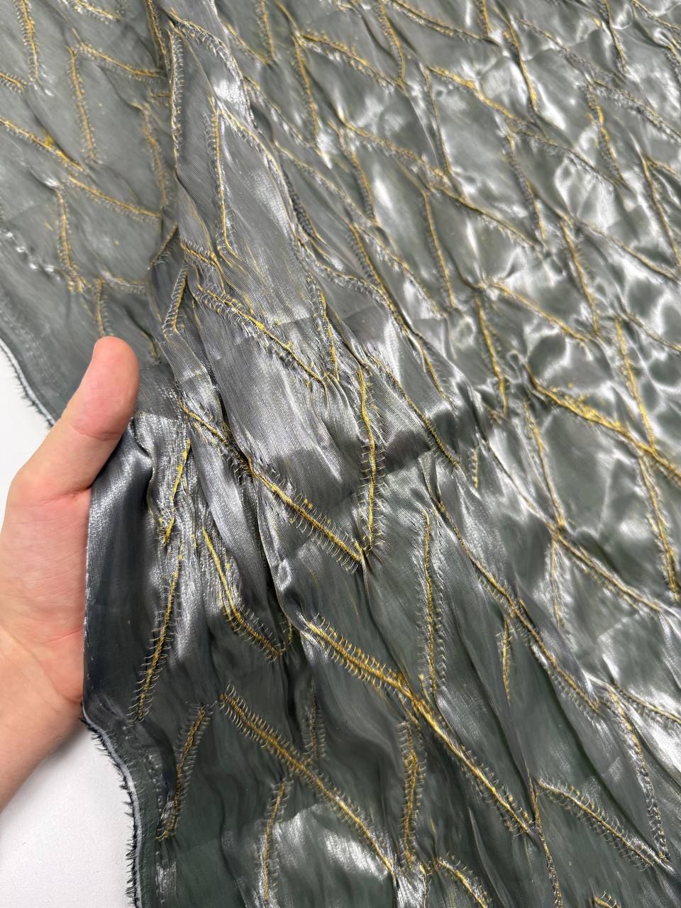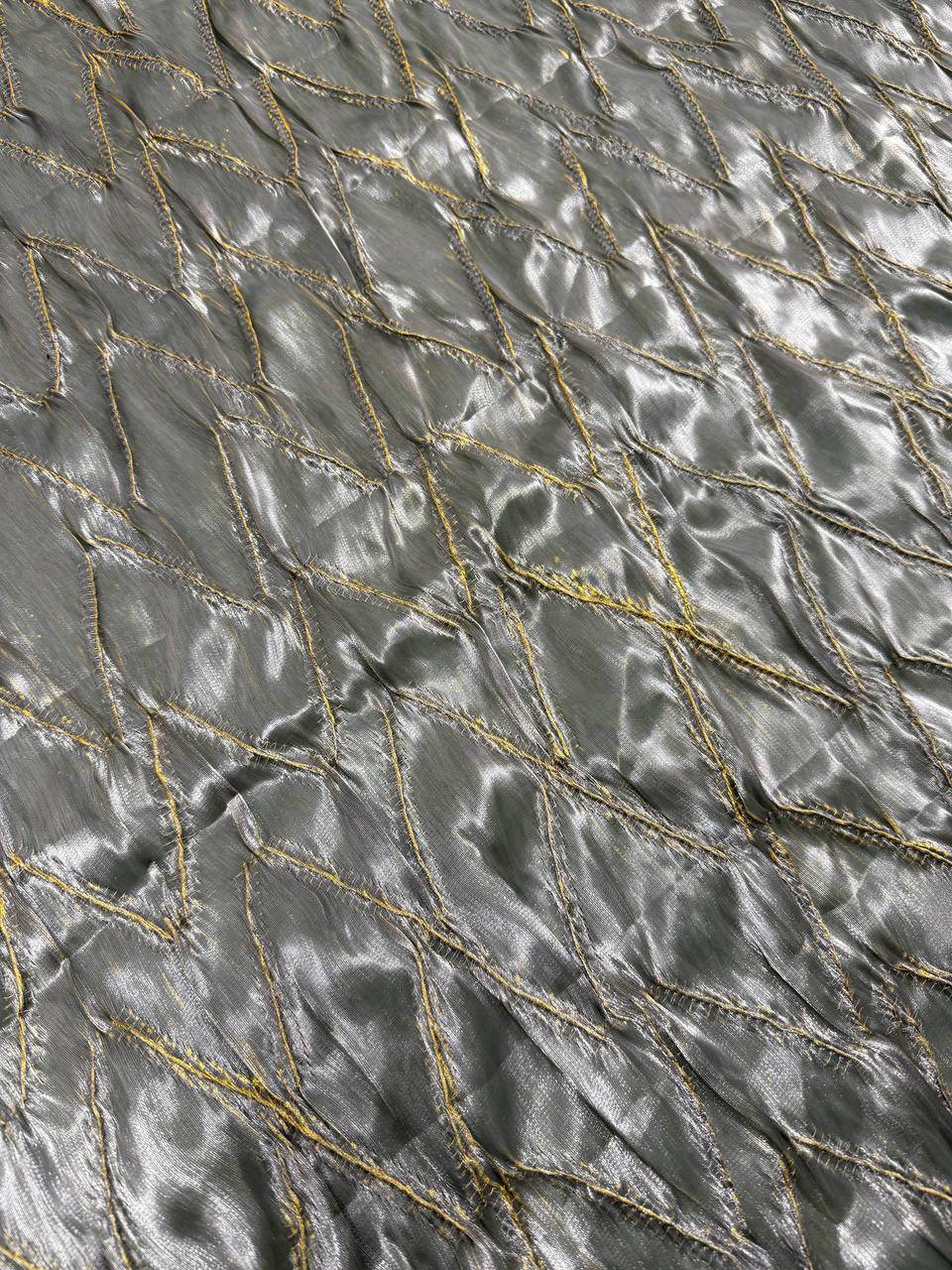 High-quality organza that captivates with its exquisite beauty and functionality. The material features a liquid steel effect, creating the illusion of fluidity and flexibility, making it ideal for crafting fashionable and stylish pieces. It is adorned with diamond-pattern embroidery, offering breathability and a pleasantly tactile feel.