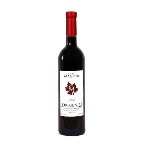 This is a bottle of Origen 43 by Casa Magoni from Mexico. Made from carefully selected grapes, this red wine has a charming color and a fragrant nose. This high quality table wine is ideal for treating guests.