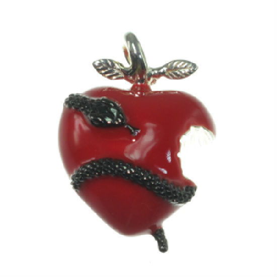 This charming heart pendant, is called the original sin heart, with a leaf bale and a serpant wrapped around the heart and the bite that changed man kind. black rhodium plating on the snake rally makes it stand out against the red enamel.
