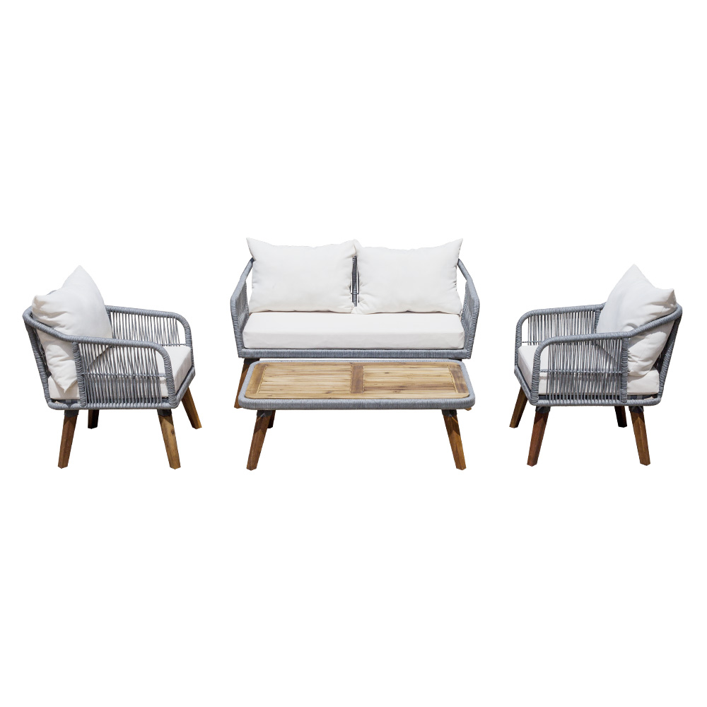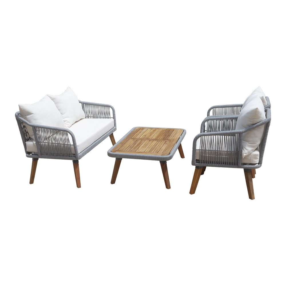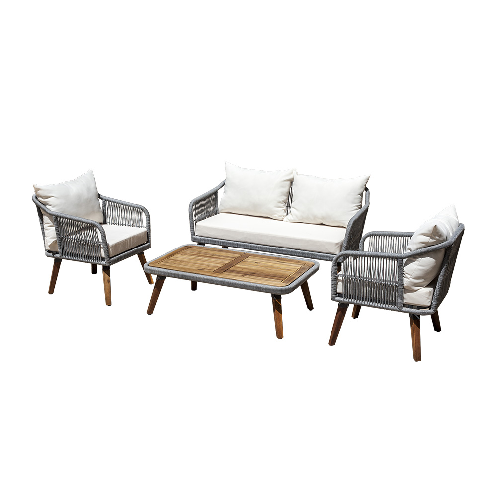 Good crafrsman ship, quality material for outdoor used, Acacia wooden table top and legs. Weather resistant rope weaving and sturdy steel frame.