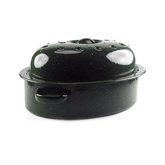 This is an oval-shaped roaster in allover black. It features a matching lid, two ergonomic handles and a smooth finish. There are various designs available for you to choose from.