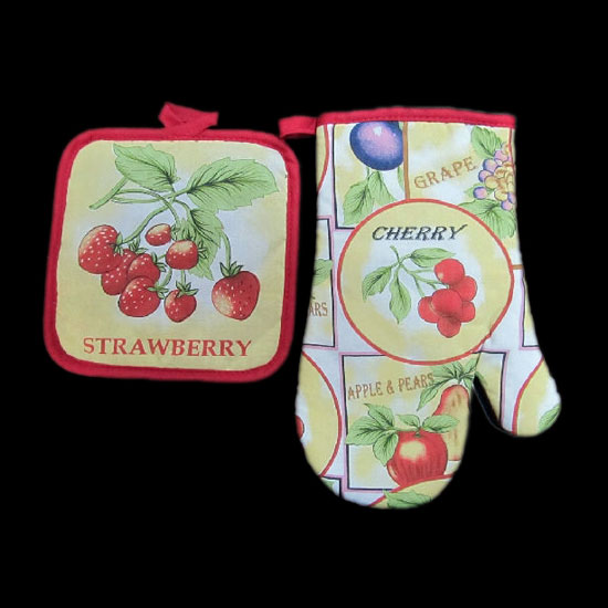 This fruit-theme kitchen textile set comes with a pot holder and an oven mitten. Made with pure cotton and polyester, the pot holder and the oven mitten durable and heat-insulated. The set ensures safety for users in the kitchen.