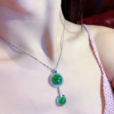 This necklace exudes a look of exquisite and timeless elegance. The pendant features a graceful double-circle design, set with two full, polished jadeite cabochons. These jadeite stones boast a deep, saturated emerald-green color, with a smooth, warm texture. Each jadeite is encircled by a brilliant halo of sparkling small gemstones, adding a luxurious visual contrast and linking the stones seamlessly. The overall design is clean and fluid. When worn, the gentle glow of the jadeite beautifully complements the shine of the accent stones, perfectly showcasing a woman's nobility and classic grace.