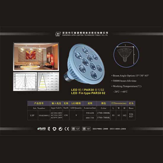 The featured fin-typed PAR30 bulb is fitted with 9 top-grade LEDs, promising stable and reliable illumination. Professionally engineered, this LED bulb can work for more than 50,000 hours. This highlighted PAR30 LED bulb is compatible with a wide range of lighting products.