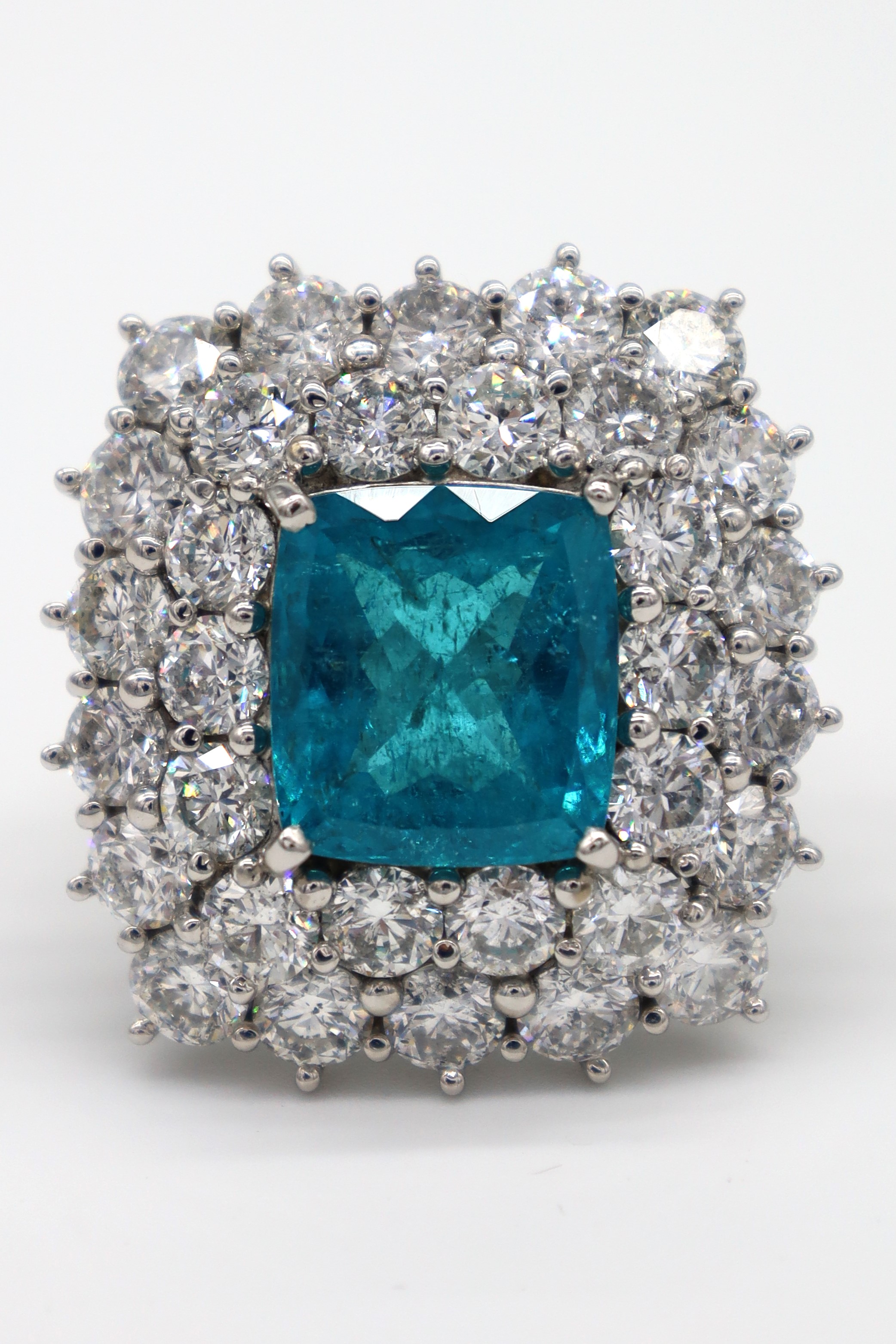 Platinum (PT900) Paraiba tourmaline ring featuring a breathtaking 9.32ct center stone with 10.19ct of accent stones. Weighing 28.80g, this exquisite piece boasts a neon-color gemstone of Brazilian origin, certified by GIA/GRS. A rare and vibrant statement of luxury and elegance.