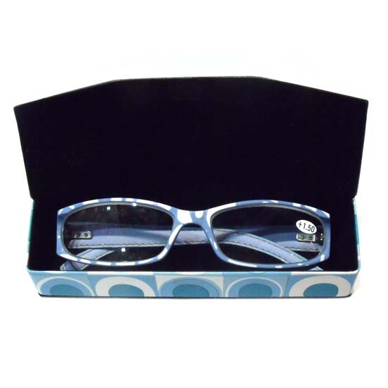 This pair of PC reading eyeglasses boasts a trendy design. The full-rimmed frame comes with white dotted patterns. The imitation leather case also features blue circular prints for correspondence. This pair of PC eyeglasses is meant for people with a dynamic and energetic lifestyle.