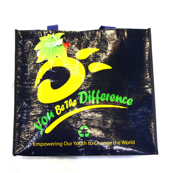 The shopping bag features a black background topped with a brightly colored logo and words. Made of top quality PET material, the eco-friendly shopping bag is sturdy enough to hold your grocery. The bag is great for promotional and personal uses.