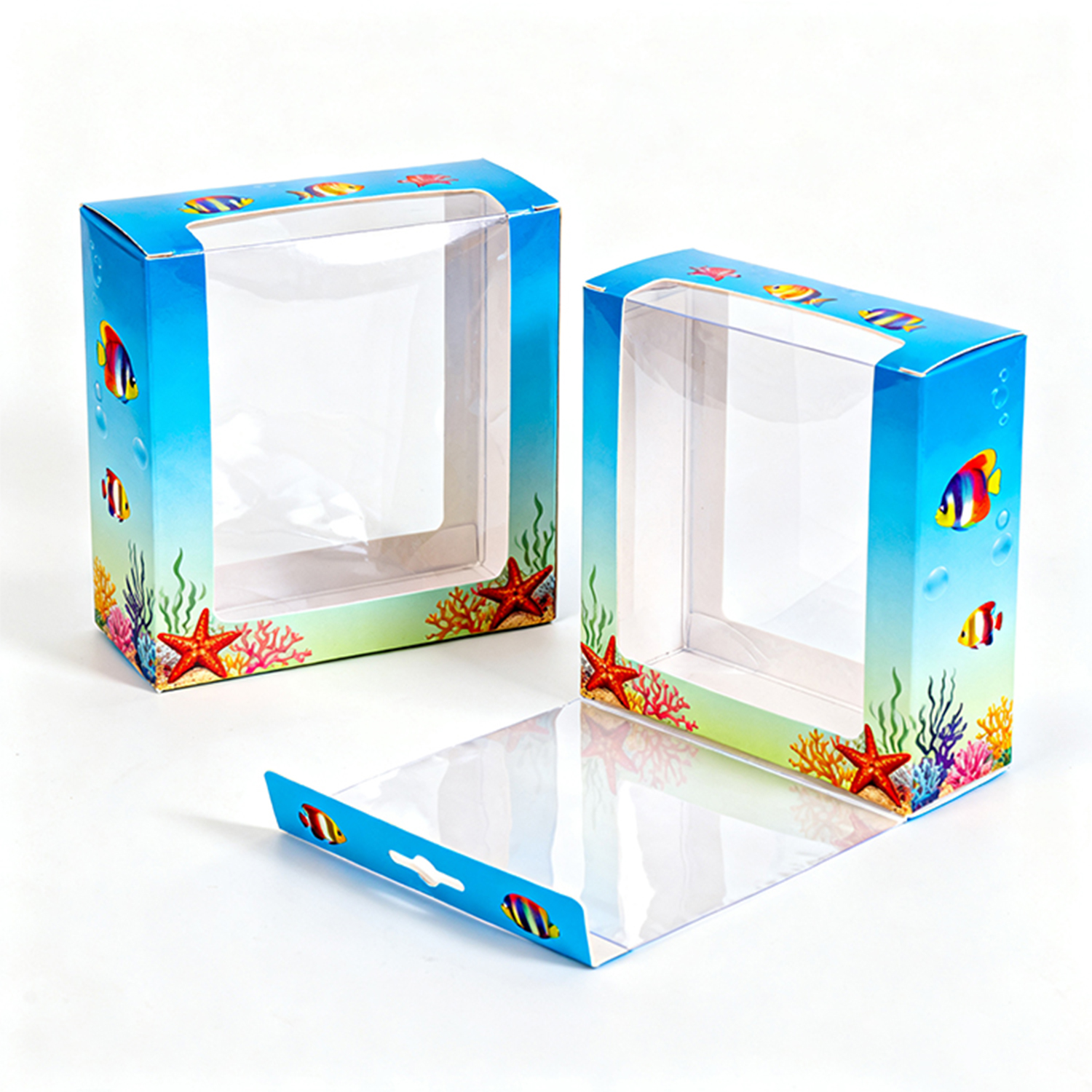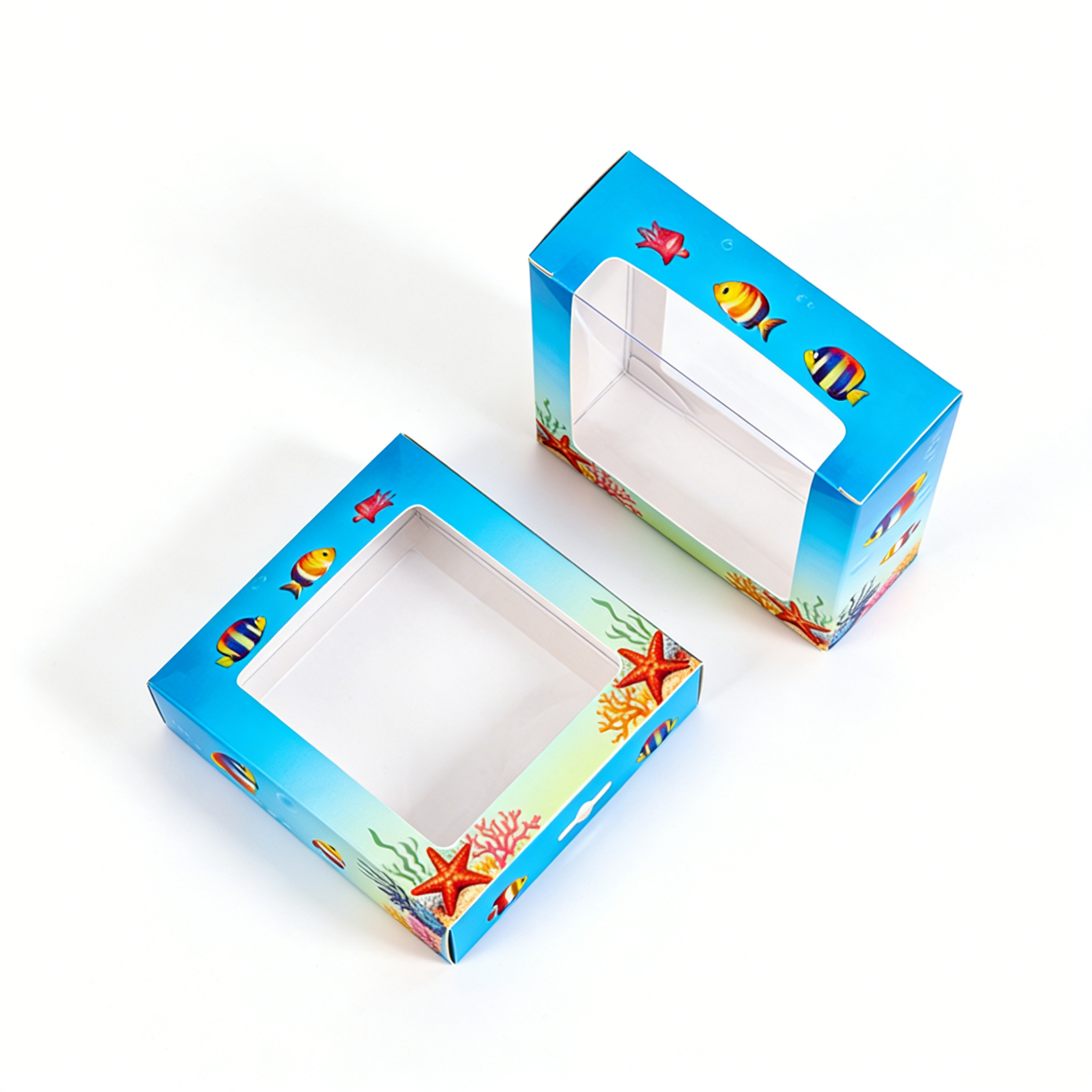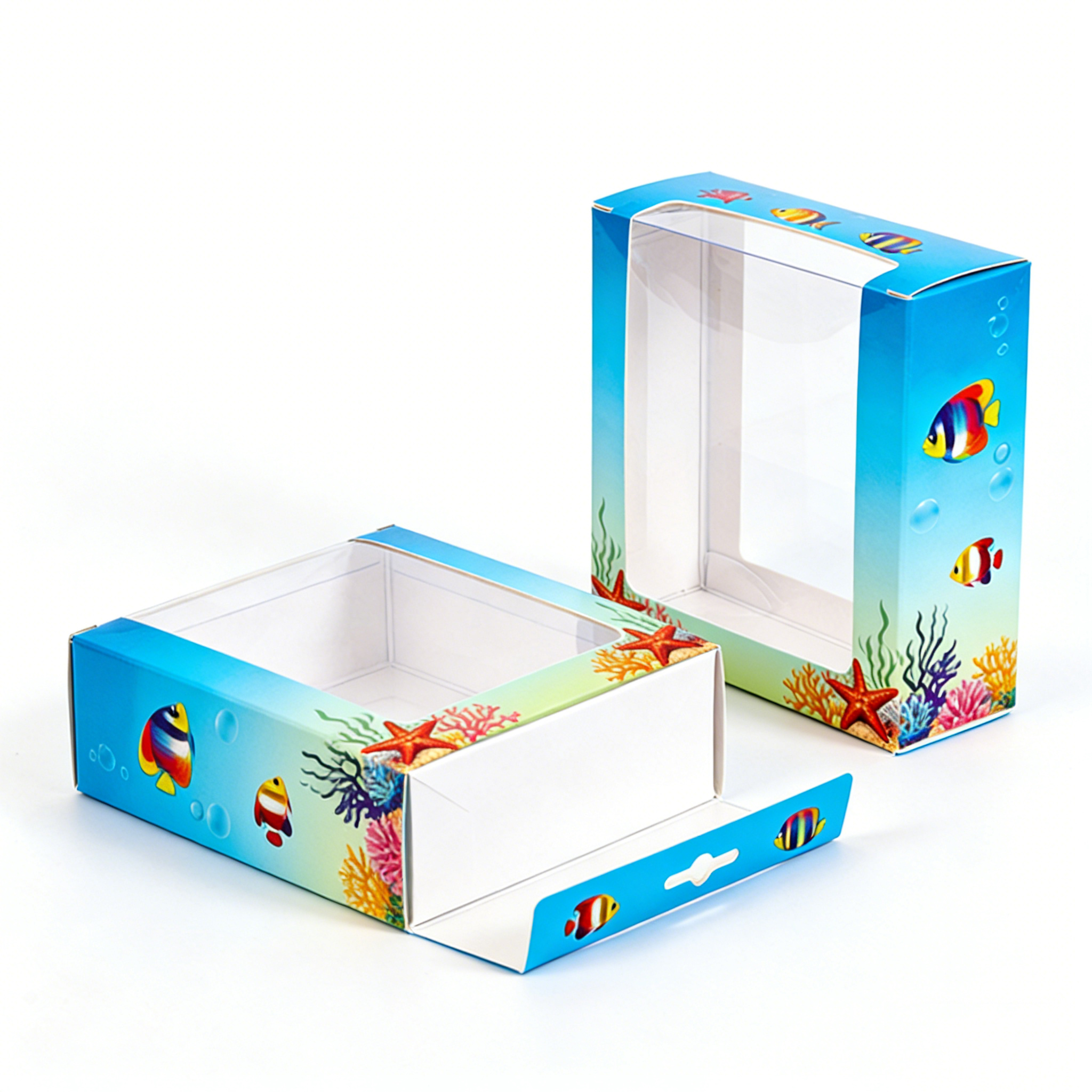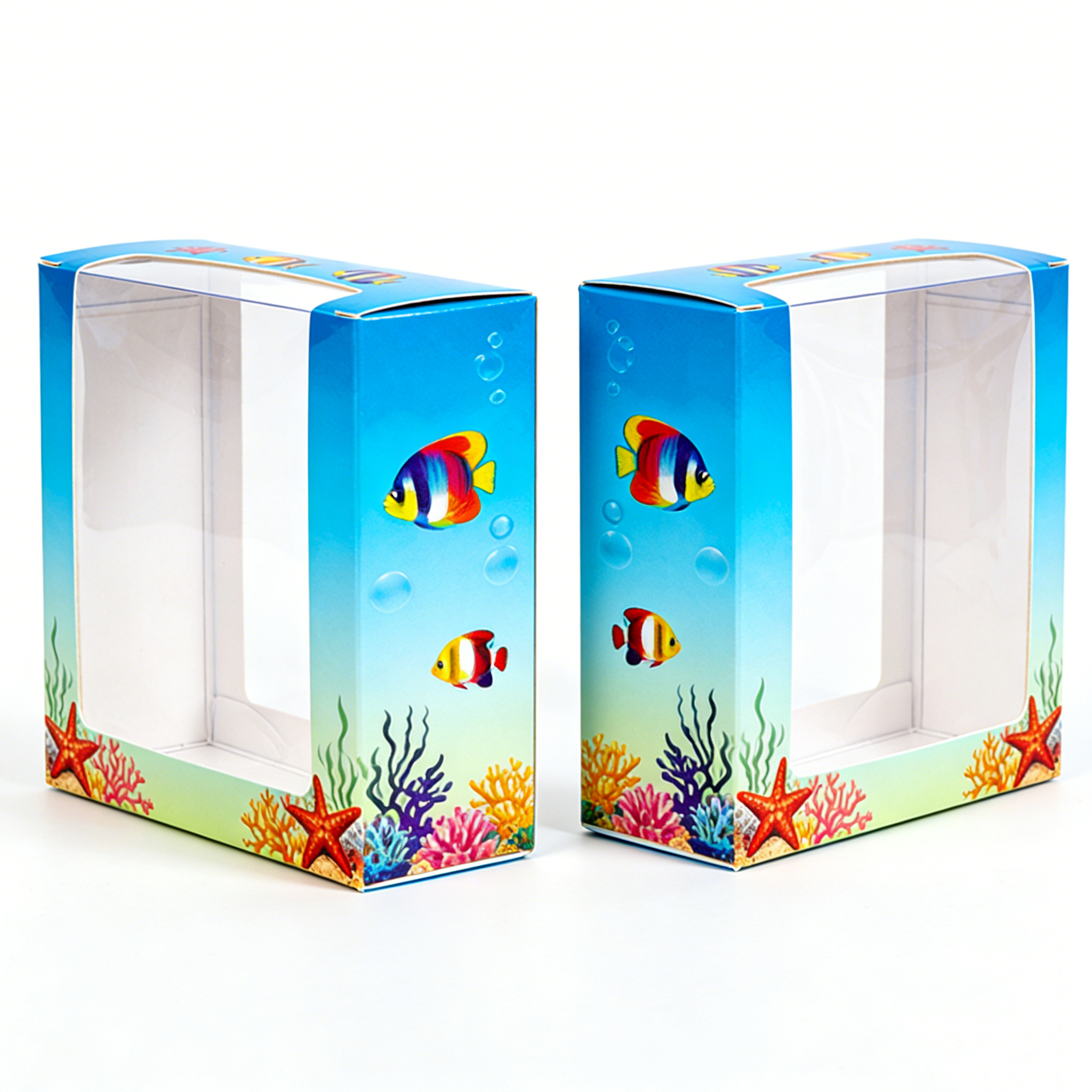 The first thing that sets this card box apart is its playful and colorful design. Featuring an underwater theme with vibrant fish, coral reefs, and starfish, the packaging creates a sense of imagination and fun—perfectly aligned with the emotional appeal of toys and dolls.