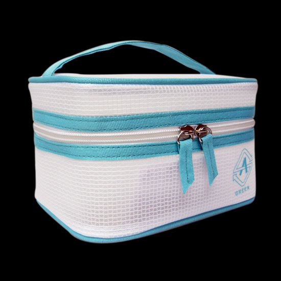 Featured here is a mesh cosmetic bag composed of biodegradable PEVA material. The zipped closure allows easy access to the contents. This eco-friendly PEVA makeup bag features a customized printed logo, making it ideal for promotional use.