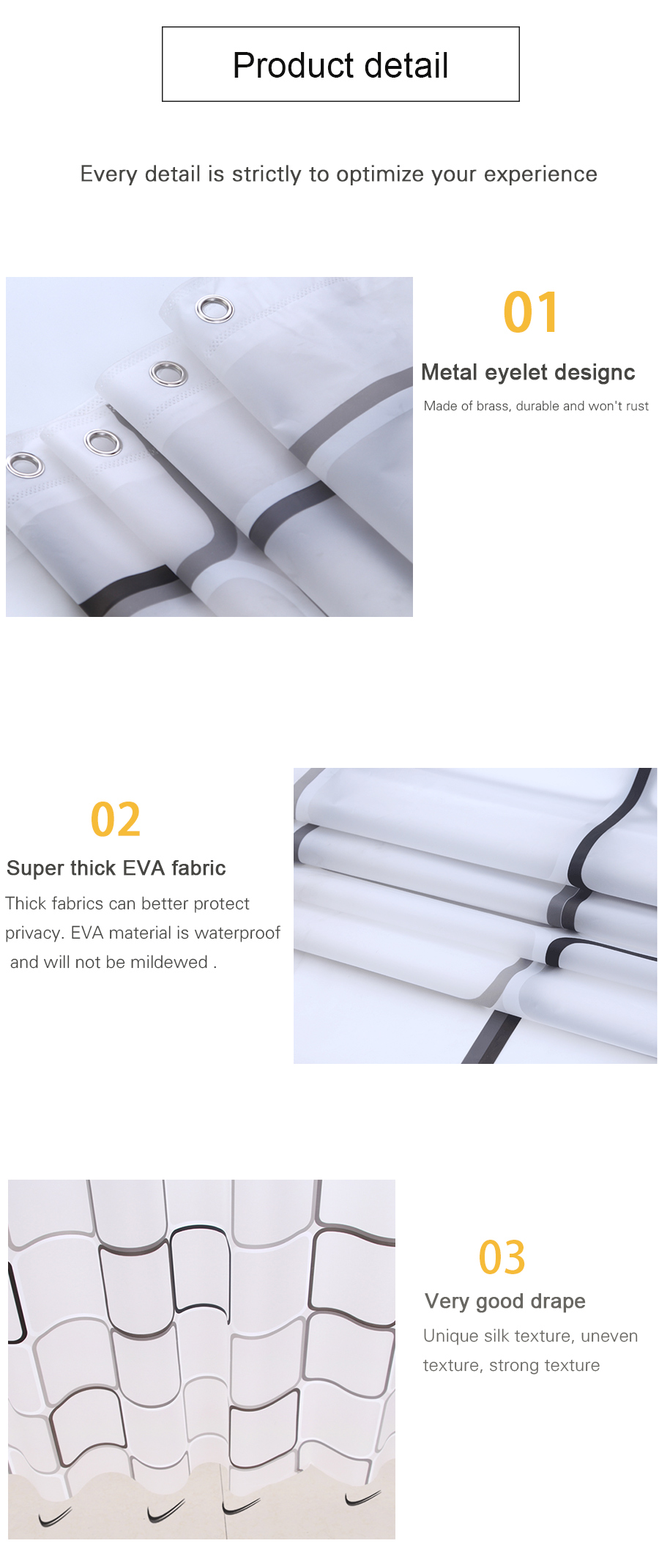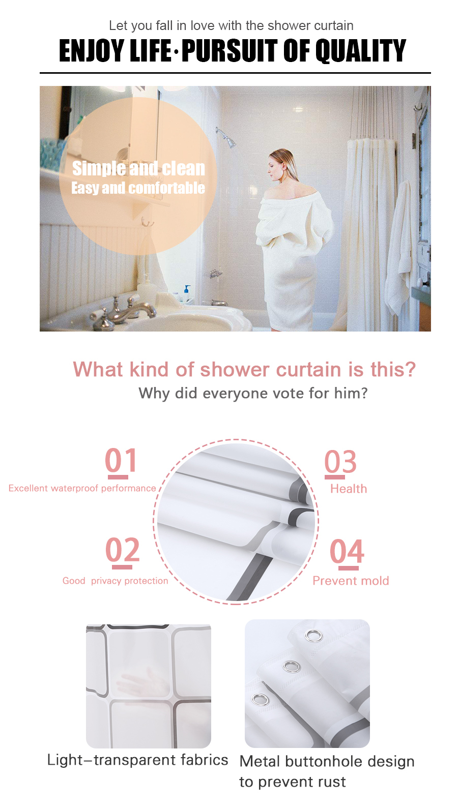 Shower curtain Size (width*high)or(length*height): 150*180cm, 150*200cm, 180*180cm, 180*200cm, 180*220cm, 200*180cm, 200*200cm, 200*220cm, 240*180cm, 240*200cm
