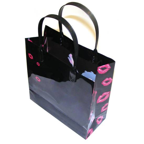 This is a PVC shopping bag. It comes with kisses pattern. Other designs can be printed upon request. The bag is suitable for small and light items.