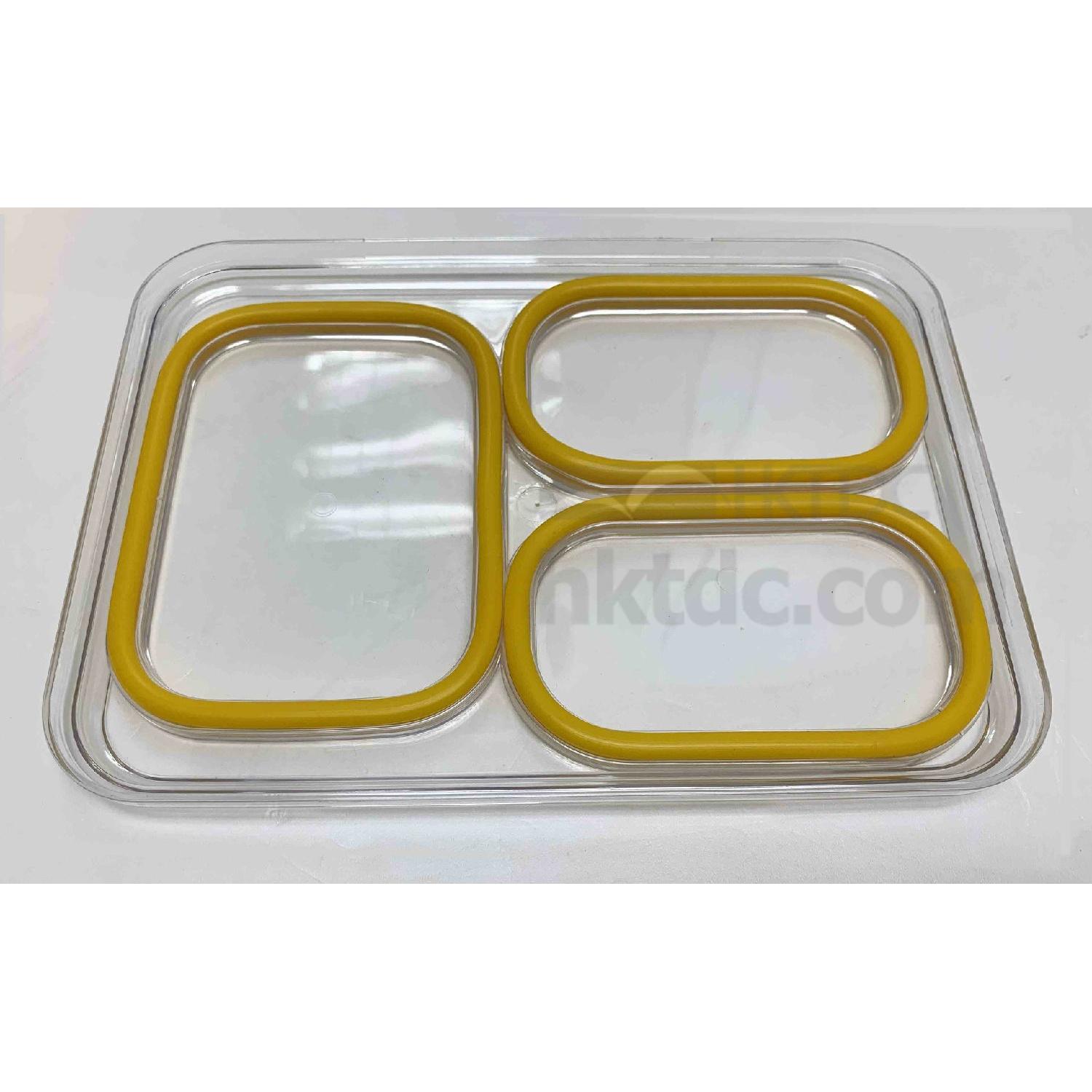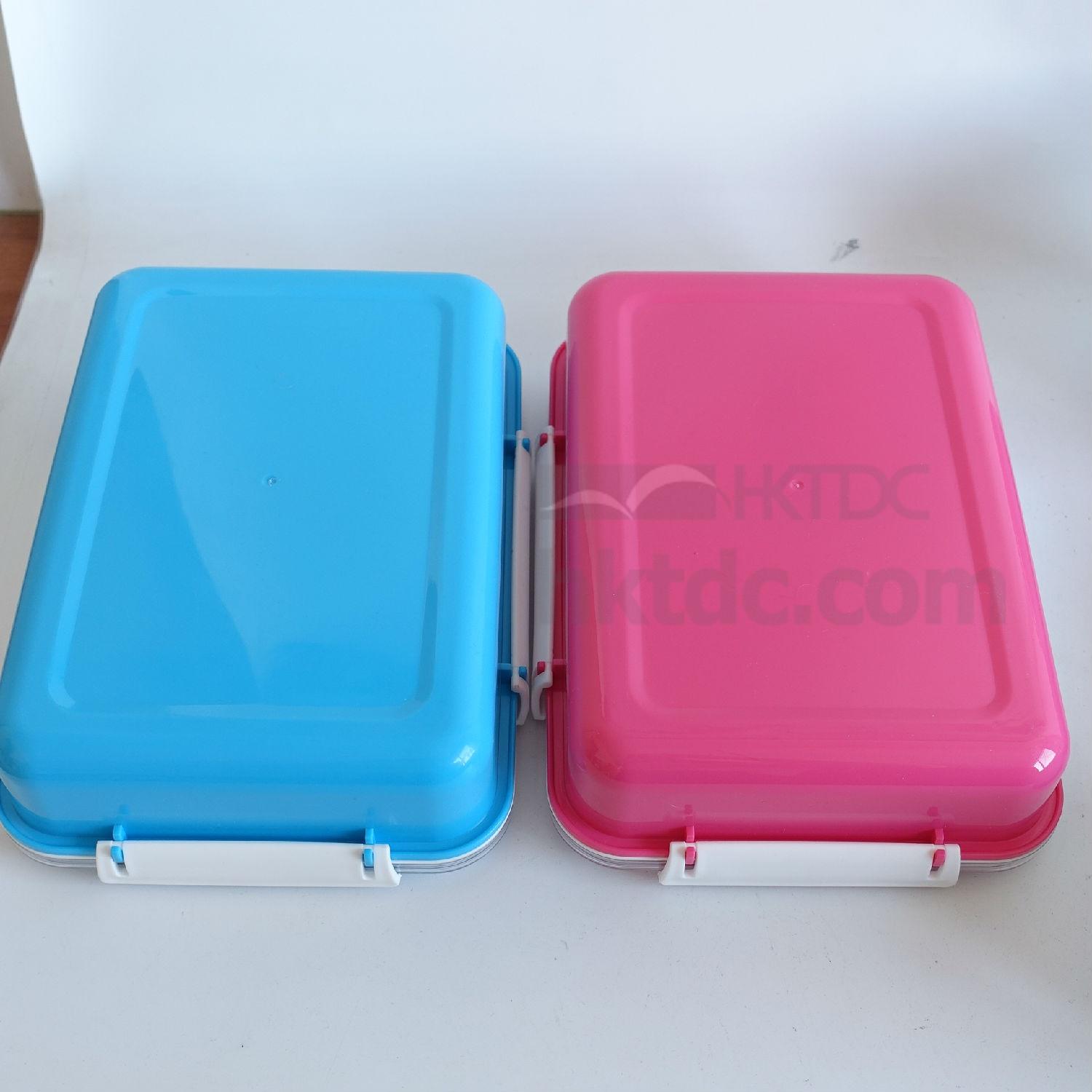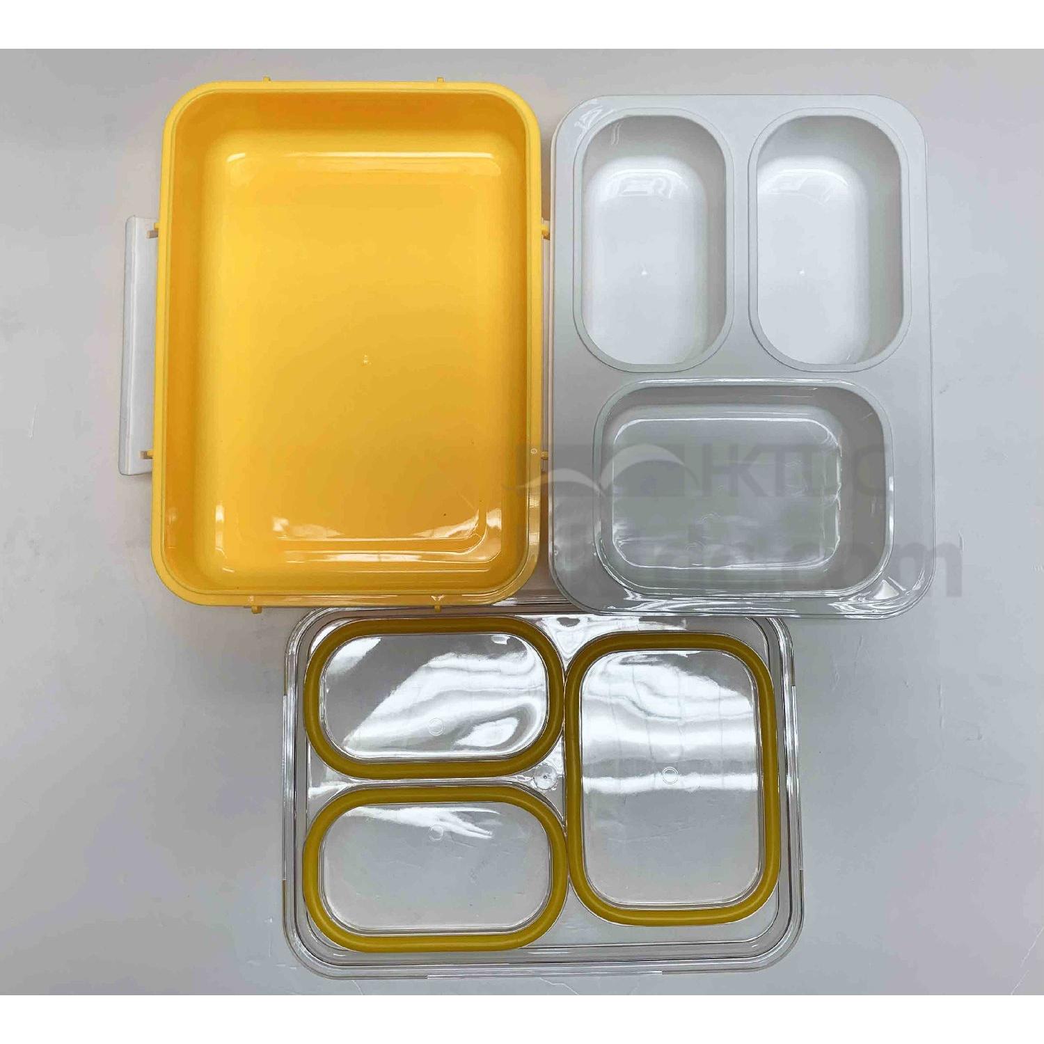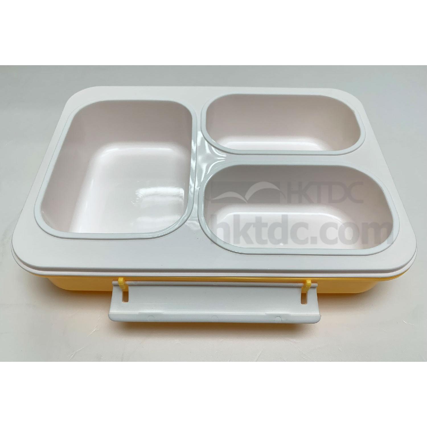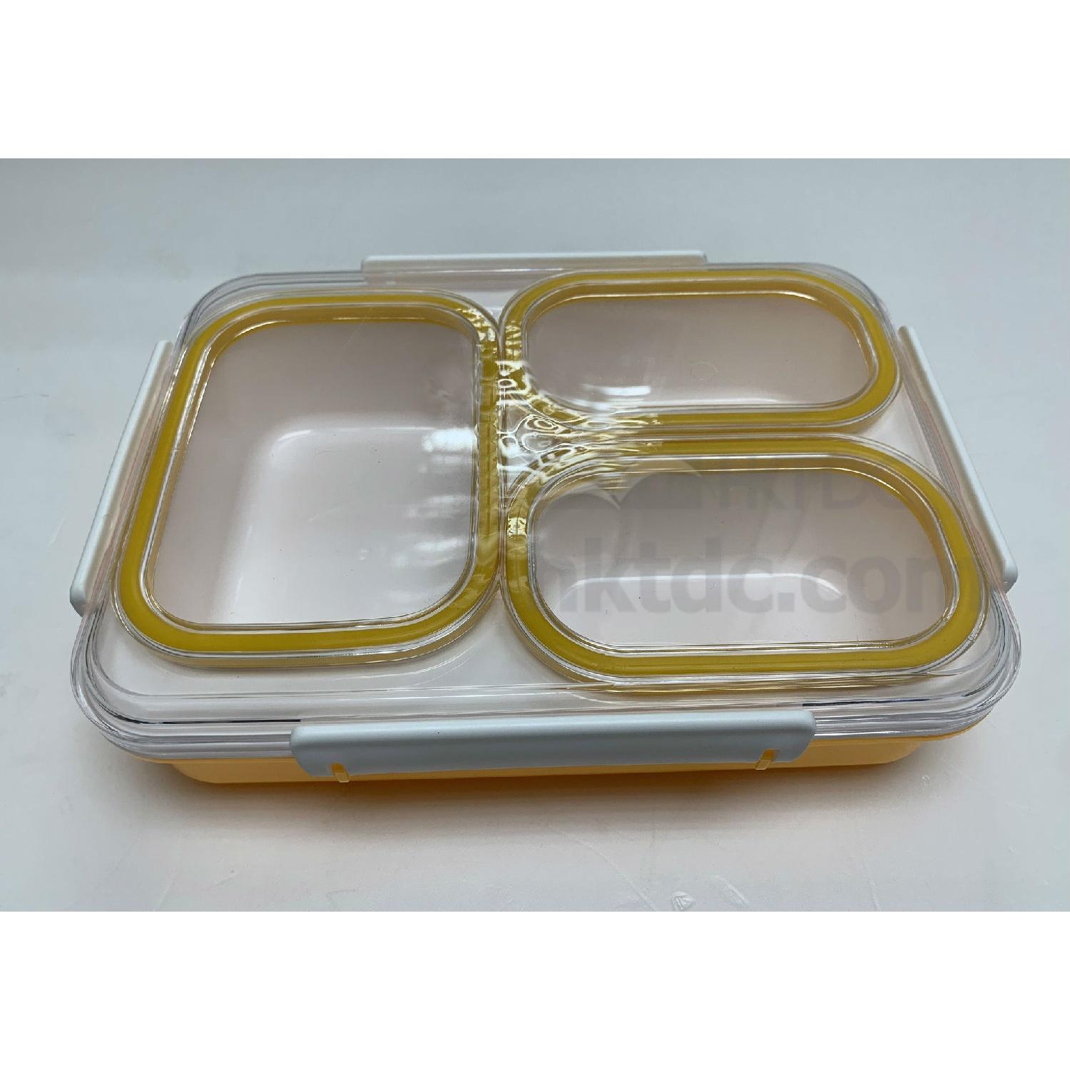This PP lunch box comes in a rectangular design and has a three-section tray to provide separate storage of food. It has a hinged lid for closure and has clasps on the side for locking the lid. The lunch box flaunts a lightweight yet durable construction and is perfect for picnic, school and office use.
