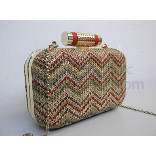 Elegance box frame case in multi color. Zig zag pattern. PP straw with chain shoulder strap.