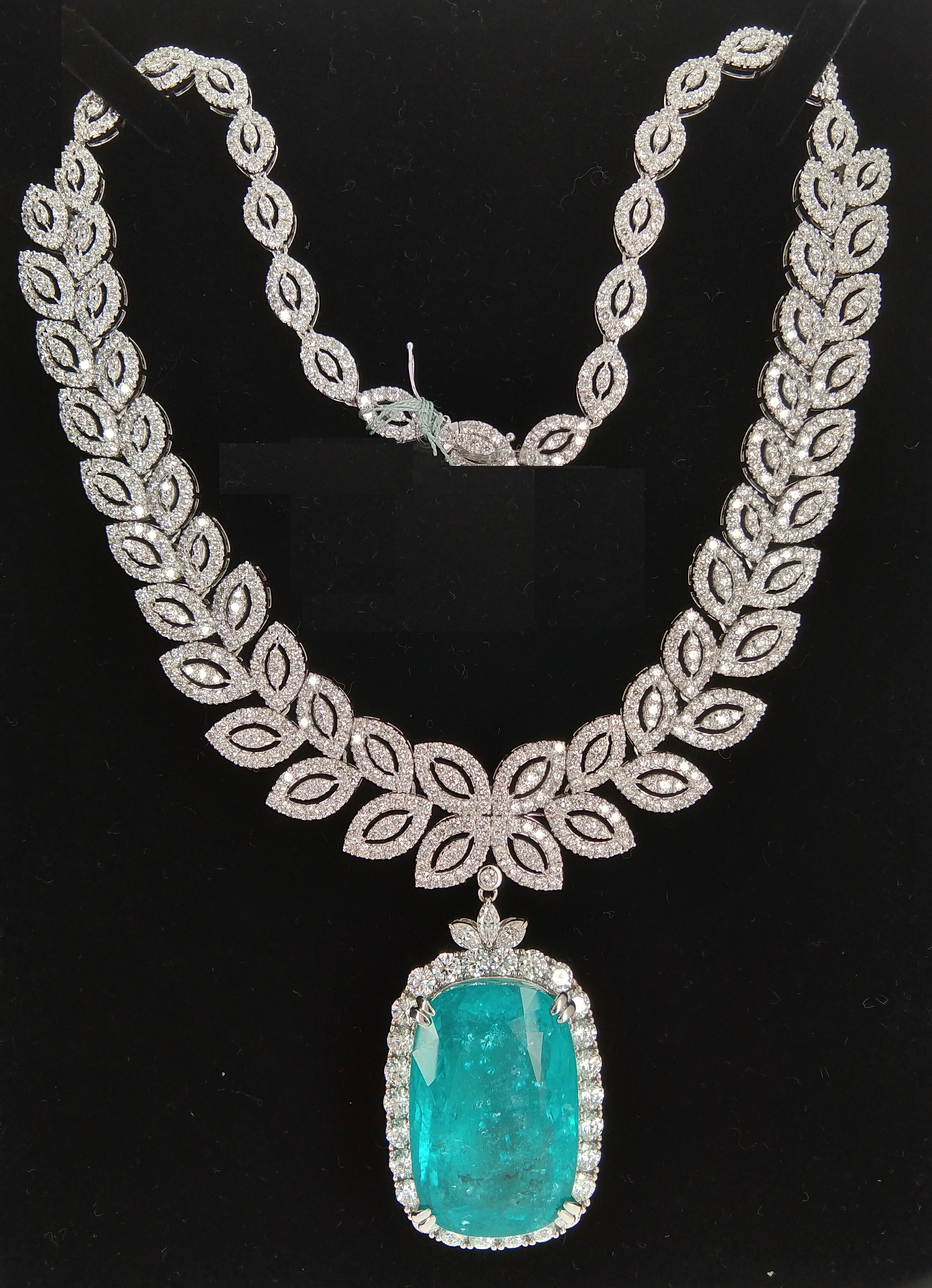 It is PT K18WG Paraiba Necklace. Pendant has Paraiba of 88.37 carat and side stone of 5.687/0.54 carat & Neck side stone is 21.58 carat.