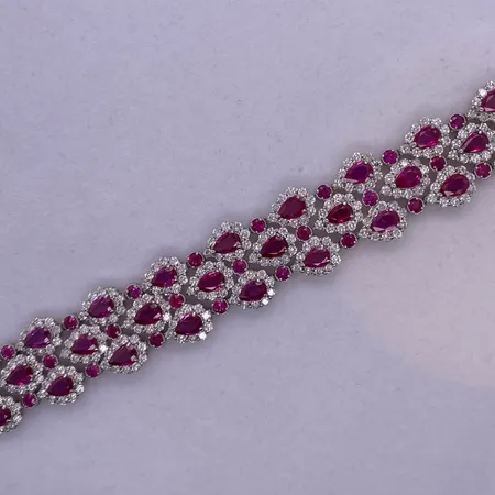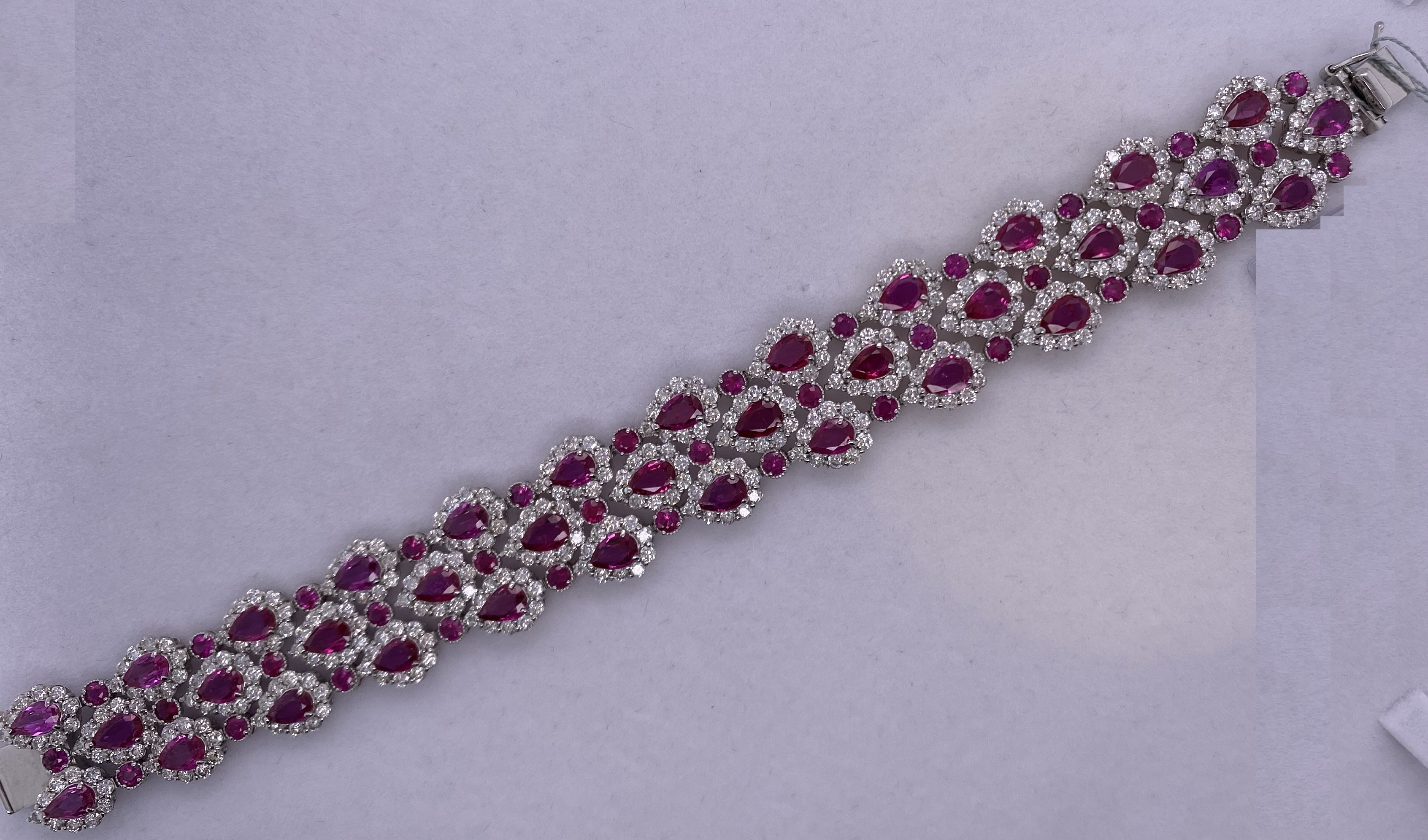 It is PT Ruby Bracelet. There are 36 pcs of Pear Shape ruby with AIGS certification of No Heat & Pigeon blood carat of which is 13.46. Also, there are 36pcs of round ruby the carat of which is 3.22. Total diamond is 9.17 carat. Total weight of the piece is 38.35 grams.