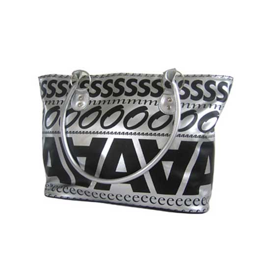 Showcased is a fashionable handbag designed in a tote-bag style. The bag features a silvery PU shell highlighted by large black prints. This handbag makes a cool choice for casual wearing.