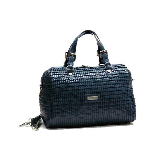 This is a fashionable ladies' handbag with an elegant and chic design. It features a rectangular body in dark blue with wavy horizontal stripes. The high-quality PU material promises a durable structure.