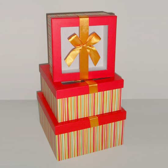 This is a square craft box coming with allover stripe patterns for attractiveness. The lid with a red rim is decorated with a yellow ribbon bow for an extra style. This delicate packaging box is made of PVC for durability.