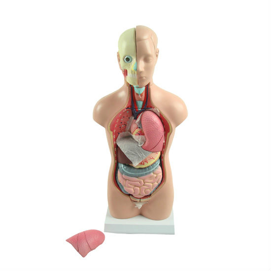 Dissectible into 18 parts: head 2pcs, brain 1pc, left lung 2pcs, right lung 2pcs, heart 1pc, trachea 1pc, esophagus 1pc, pancreas 1pc, dissepiment 1pc, liver 1pc, stomach 1pc, intestines 1pc, bladder 2pcs, body 1pc.