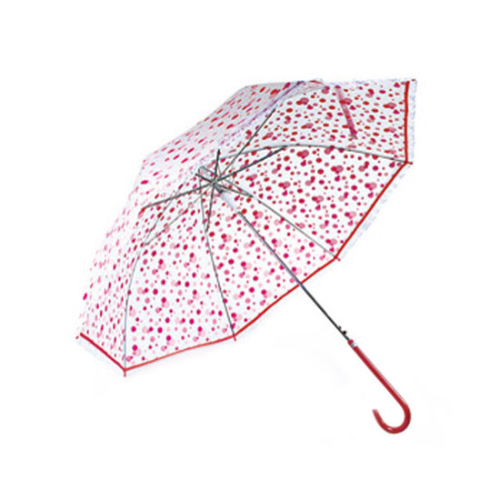 This umbrella is made with a transparent PVC canopy for a stylish look. The red-colored dots are designed for a touch of loveliness. The slim crook handle renders a girly touch to the umbrella.