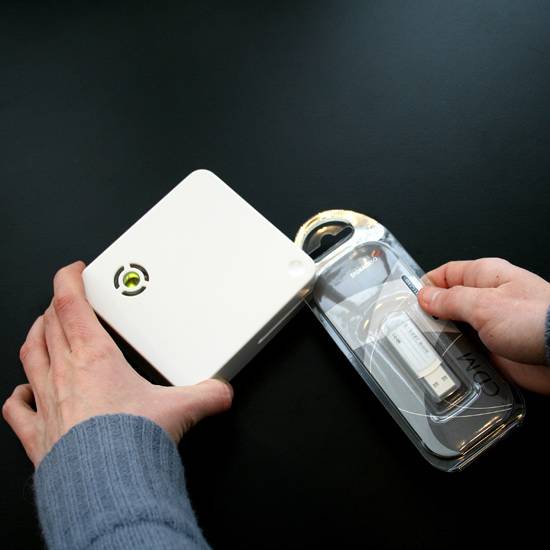 This is a package opener for stubborn plastic packaging. The unit comes in a cubular form with a slit on its end. In this slit, thin edges of packaging can be slid through and cut with a razor sharp blade